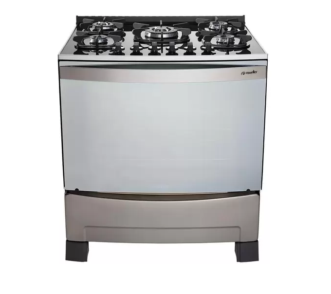 Fogão Mueller 5 bocas Decorato Vetro Inox com mesa de vidro e grade de ferro fundido